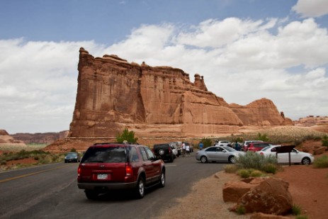 Der Arches Nationalpark gehört zu den offiziellen Highlights jeder USA-Reise. Und so bekommen wir am Sonntag um 10 Uhr einen der letzten regulären Parkplätze am Devil's Garden. Viele Autos parken schon an der Zufahrtsstraße. Nachdem die Arches relativ einfach zu erwandern sind, sind auch viele Familien mit Kindern unterwegs. Das Wetter ist heute nicht ganz optimal.