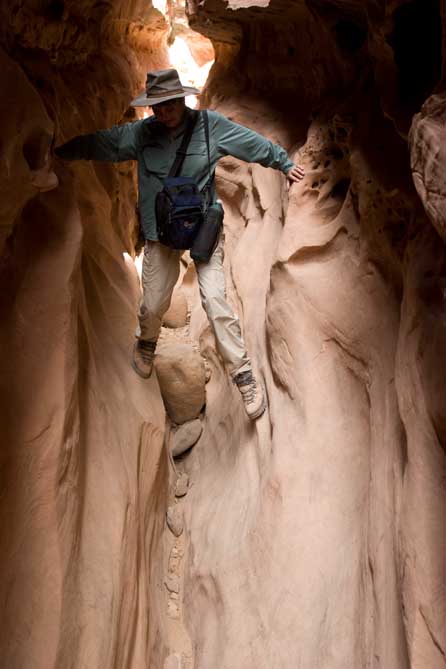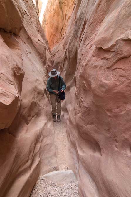 Ein beliebter Abstecher vom Valley of the Goblins State Park führt zum Little Wild Horse Canyon. Die extreme Hitze mit 30-40° C (86-104° F) macht uns zunehmend zu schaffen. Dann ist bei Manfreds Kamera auch noch der Akku alle. Also fotografiere ich heute eben für zwei.