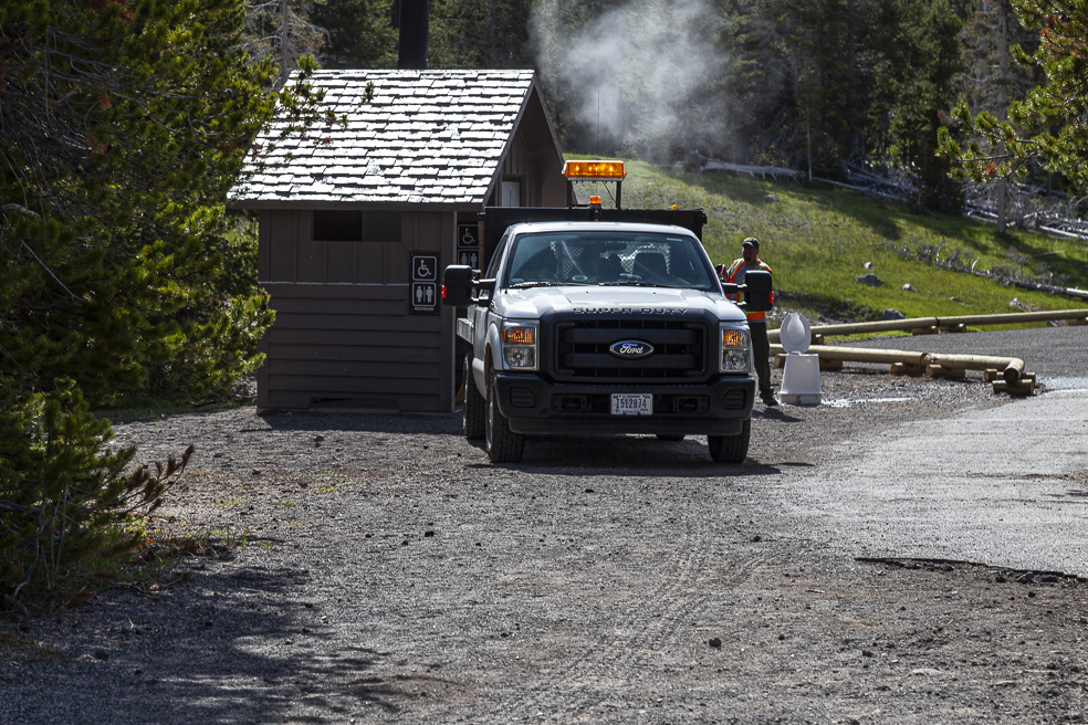 Der einzige Rest Room (amerikanische Beschönigung für Toiletten aller Art incl. der in Nationalparks und anderen Naturschutzgebieten üblichen Plumpsklos) wird kurz nach unserem Besuch gereinigt. Das ist auch dringend nötig.
