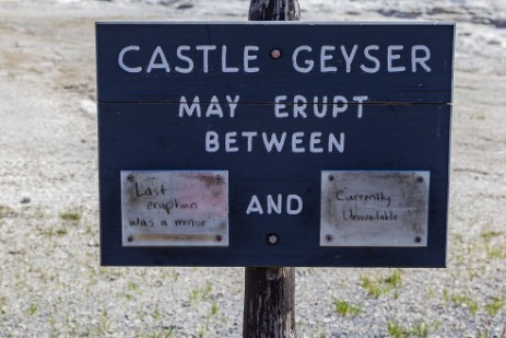 Eine Viertelstunde später erscheint ein Ranger und schreibt die sehnsüchtig erwartete Information über den vermutlichen Zeitpunkt der nächsten Eruption auf die Schilder vor dem Geysir. Leider ist es mit dem Castle Geysir sowie mit dem Internet: „Currently not available“ (derzeit nicht verfügbar).